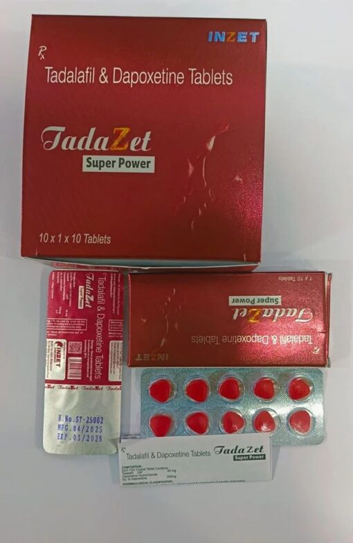 TADAZET SUPER POWER® is a long-acting compound dual-action tablet specifically designed for men. The name “Super Tada Dual-Action” directly reflects its core ingredients and dual efficacy. This product combines Tadalafil (a long-acting PDE5 inhibitor) and Dapoxetine (a fast-acting SSRI) to simultaneously address two major issues: Erectile Dysfunction (ED) and Premature Ejaculation (PE), helping men improve their sexual life quality and confidence. Its standout feature is its lasting effect of up to 36 hours, providing a more natural medication experience.